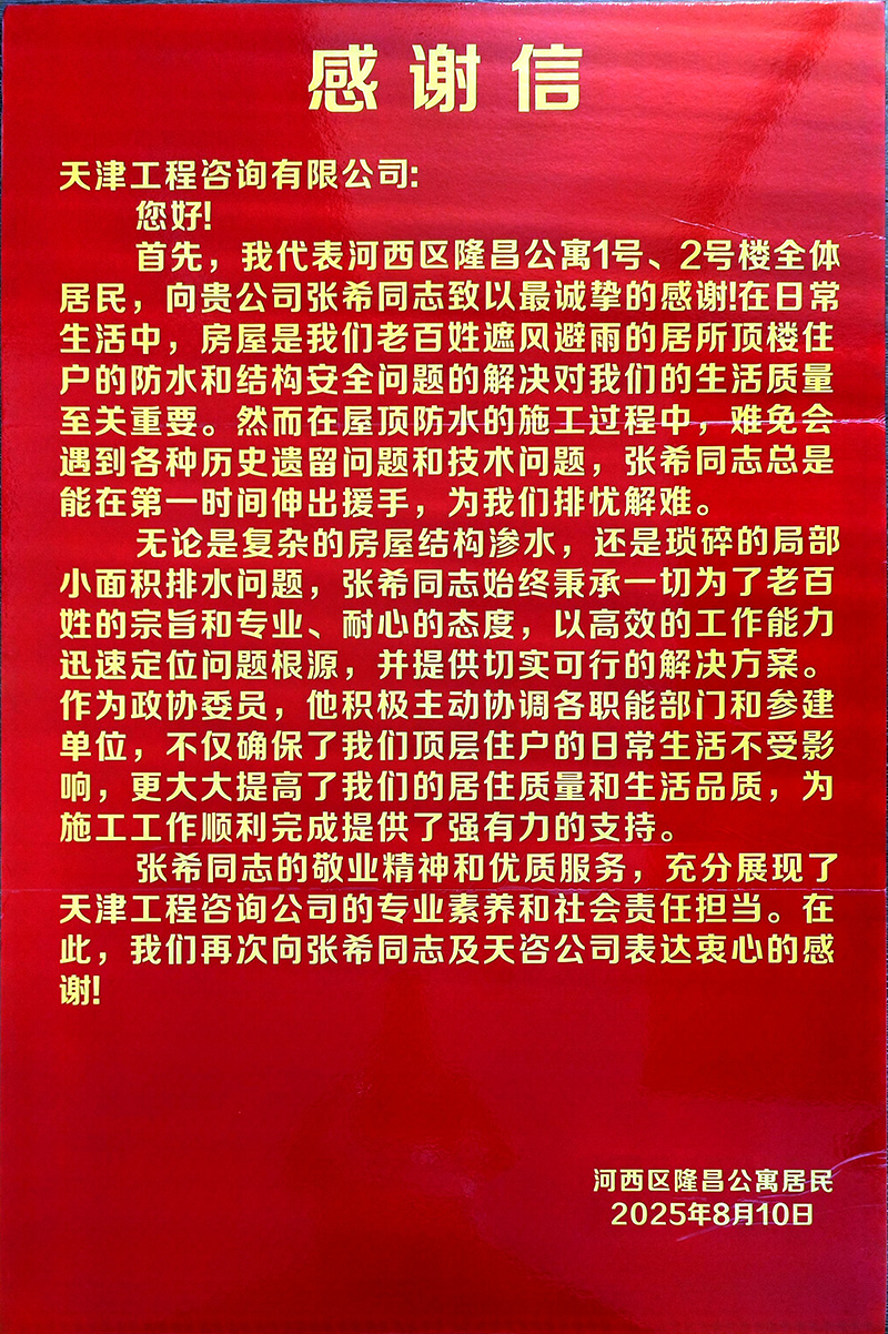 為有效促進(jìn)工程進(jìn)展,項(xiàng)目團(tuán)隊(duì)主動(dòng)加強(qiáng)與居民、街道和社區(qū)的多層次溝通。在各小區(qū)設(shè)立聯(lián)絡(luò)點(diǎn),及時(shí)公開施工與監(jiān)理信息,迅速響應(yīng)居民關(guān)切。如隆昌公寓屋面滲水問題,團(tuán)隊(duì)僅用三天便協(xié)調(diào)解決,展現(xiàn)出高效務(wù)實(shí)的作風(fēng)。施工前主動(dòng)告知計(jì)劃,協(xié)助居民做好防護(hù),合理安排作業(yè)時(shí)間避開休息時(shí)段,還為年長體弱居民提供搬運(yùn)幫助。這些細(xì)致入微的服務(wù)贏得了居民的廣泛贊譽(yù),特地送來感謝信,表揚(yáng)團(tuán)隊(duì)“專業(yè)、耐心、高效”。